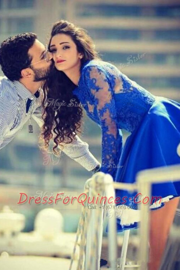Glorious Bateau Sleeveless Prom Dresses Mini Length Lace Royal Blue Satin