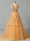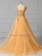Gold Lace Up Scoop Appliques and Pattern Prom Gown Tulle Sleeveless Brush Train