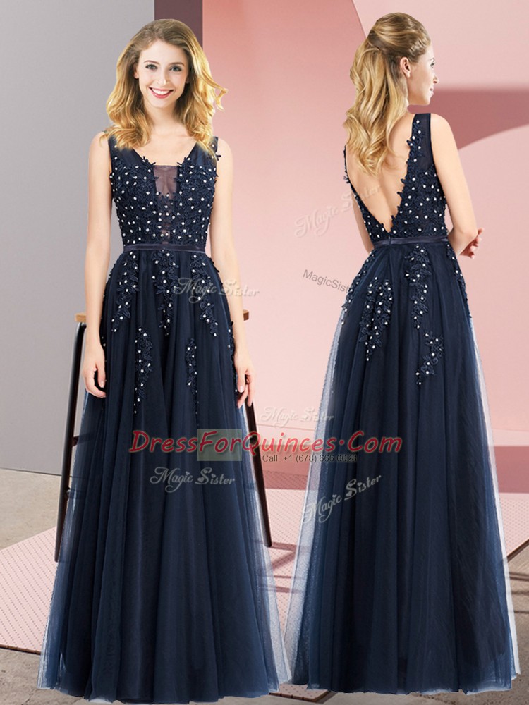 Ideal Navy Blue Backless Prom Evening Gown Beading and Appliques Sleeveless Floor Length