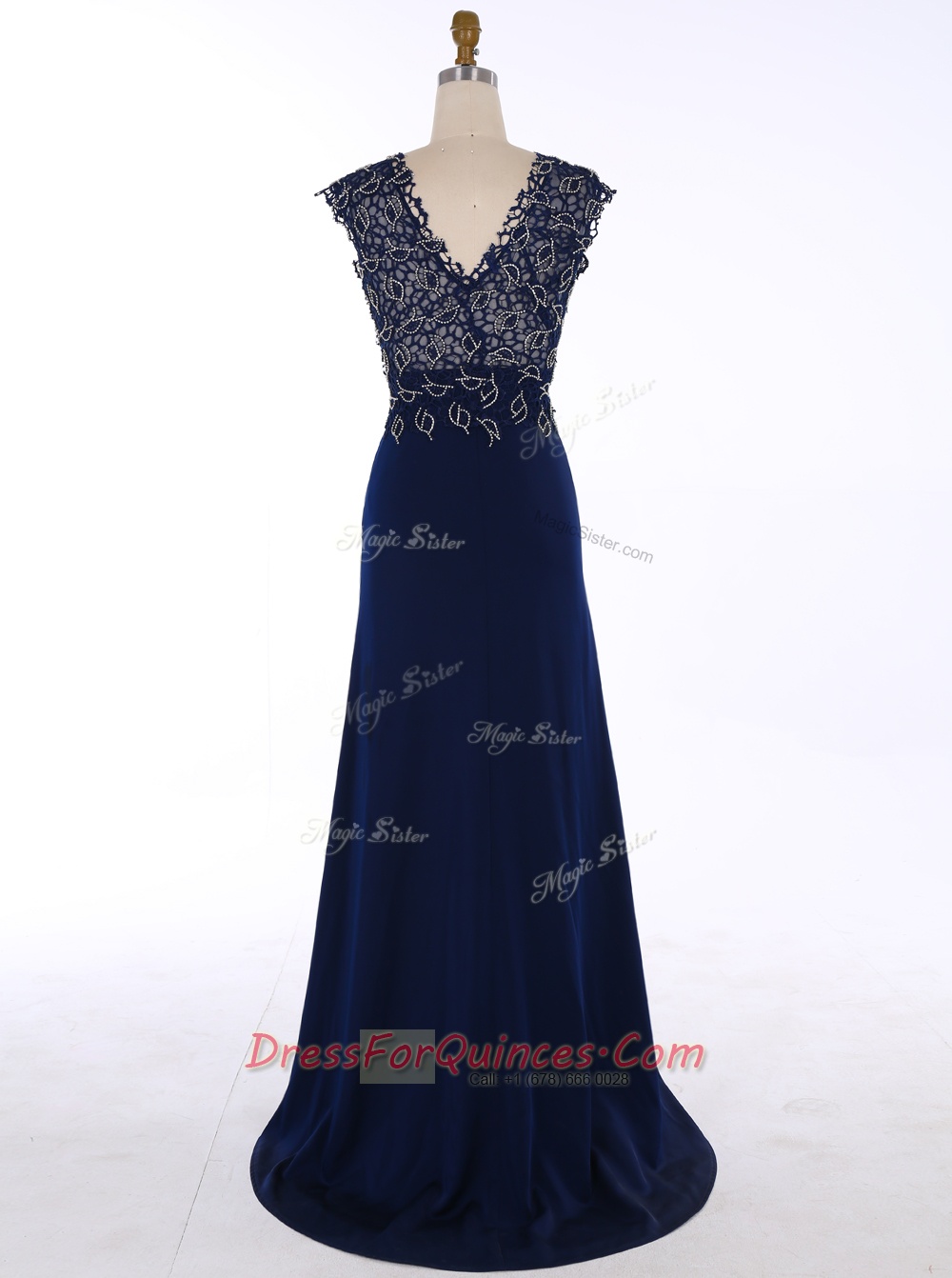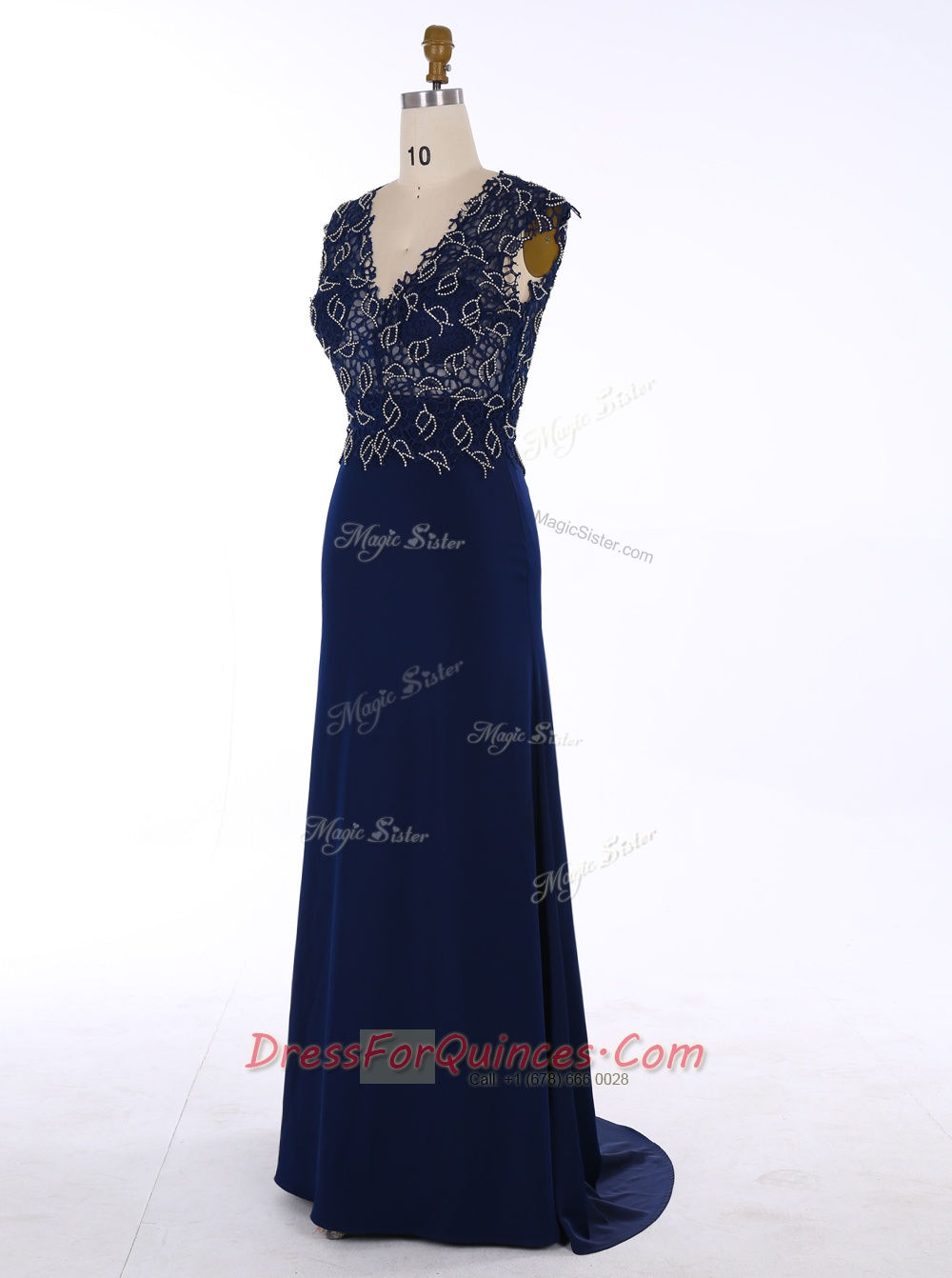 Ideal Navy Blue Chiffon Zipper Prom Party Dress Sleeveless Sweep Train Appliques