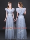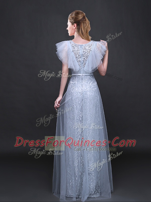 Inexpensive Lace Grey V-neck Zipper Appliques and Belt Prom Dress Short Sleeves