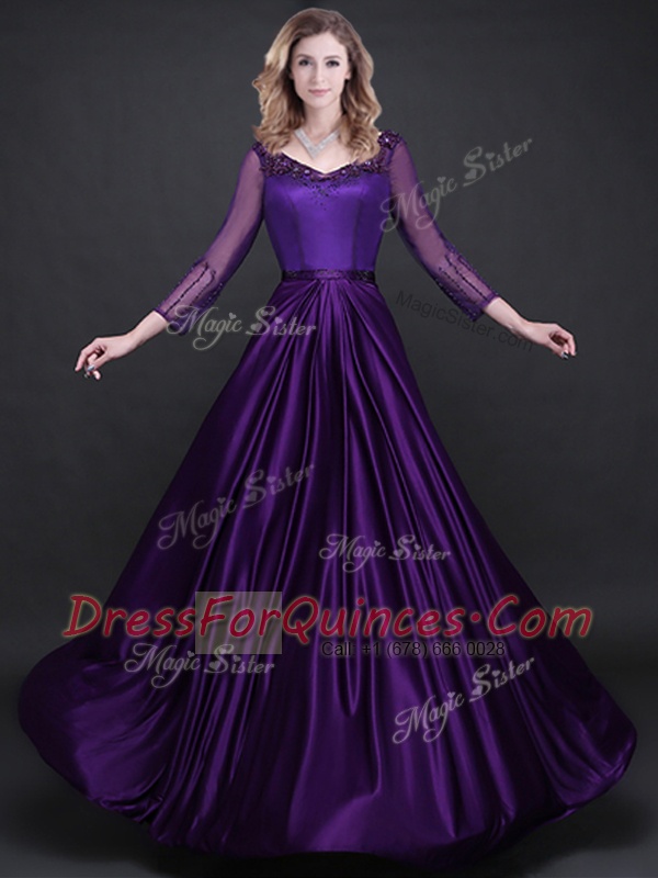 Inexpensive Purple Empire Long Sleeves Elastic Woven Satin Floor Length Lace Up Appliques and Belt Prom Evening Gown