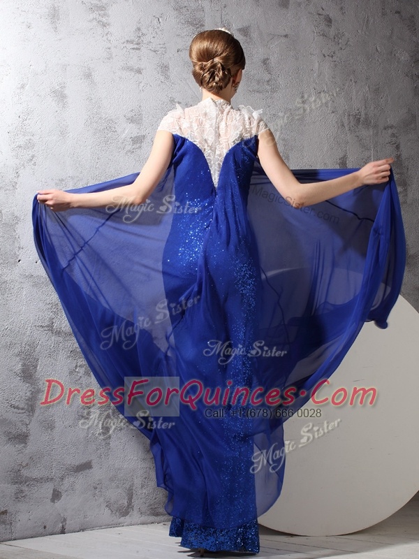 Lace and Sequins Prom Dress Royal Blue Zipper Sleeveless Floor Length
