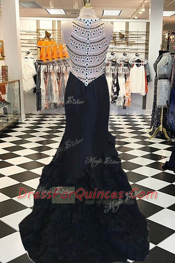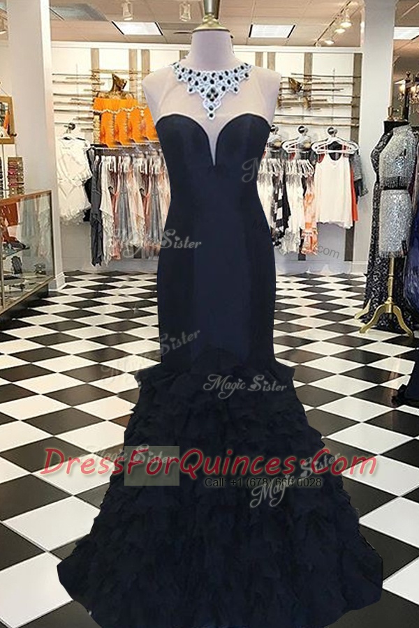 Mermaid Black Elastic Woven Satin Side Zipper Scoop Sleeveless Prom Gown Sweep Train Beading