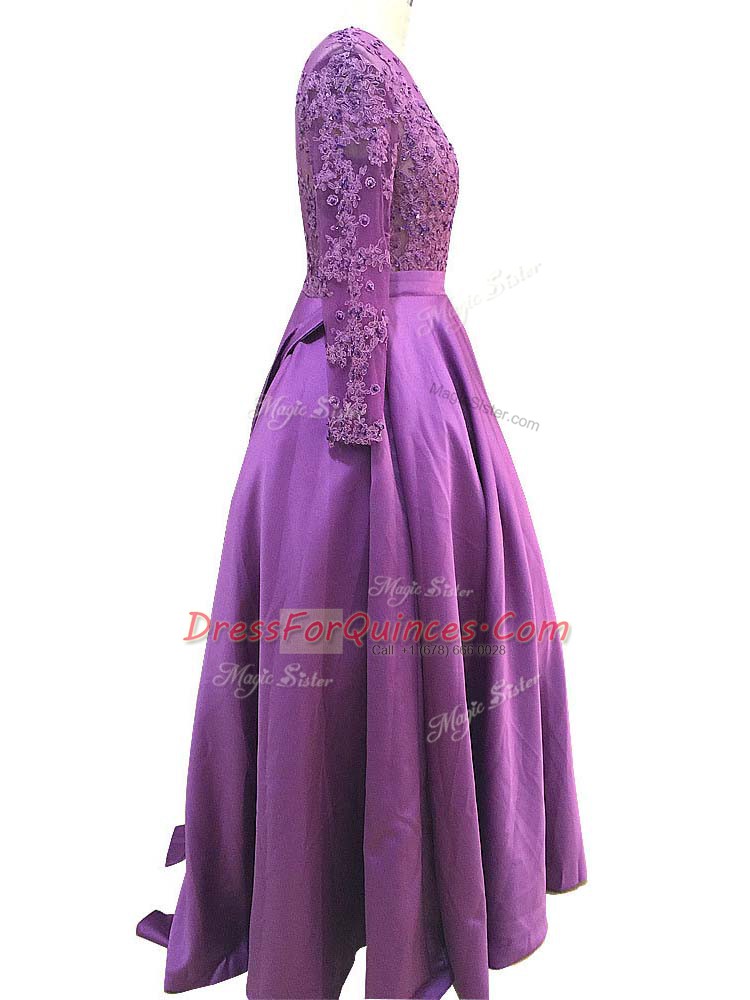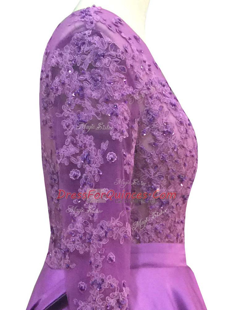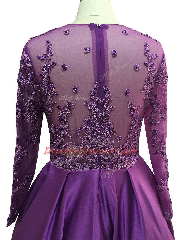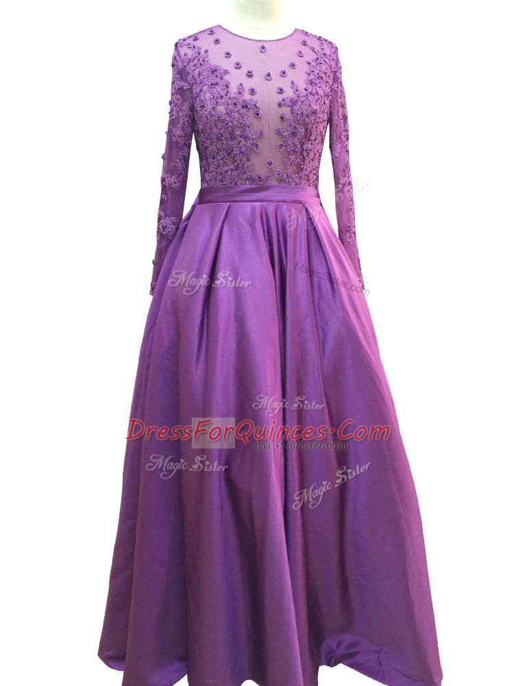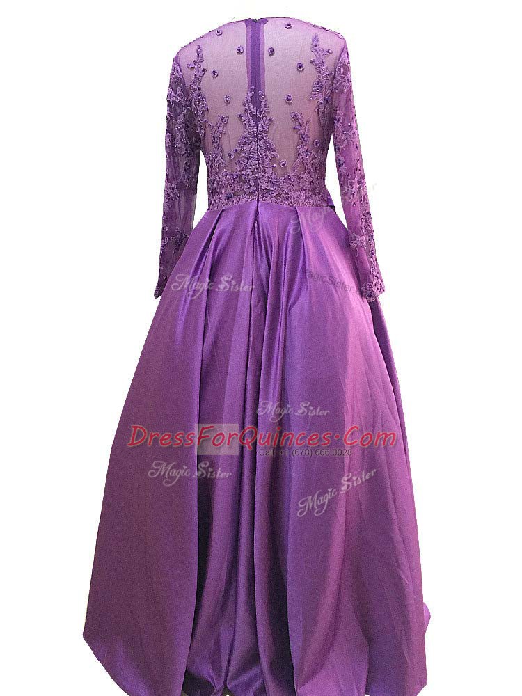 Modern Purple Taffeta Zipper Scoop Long Sleeves Floor Length Prom Dress Beading and Lace and Appliques