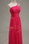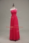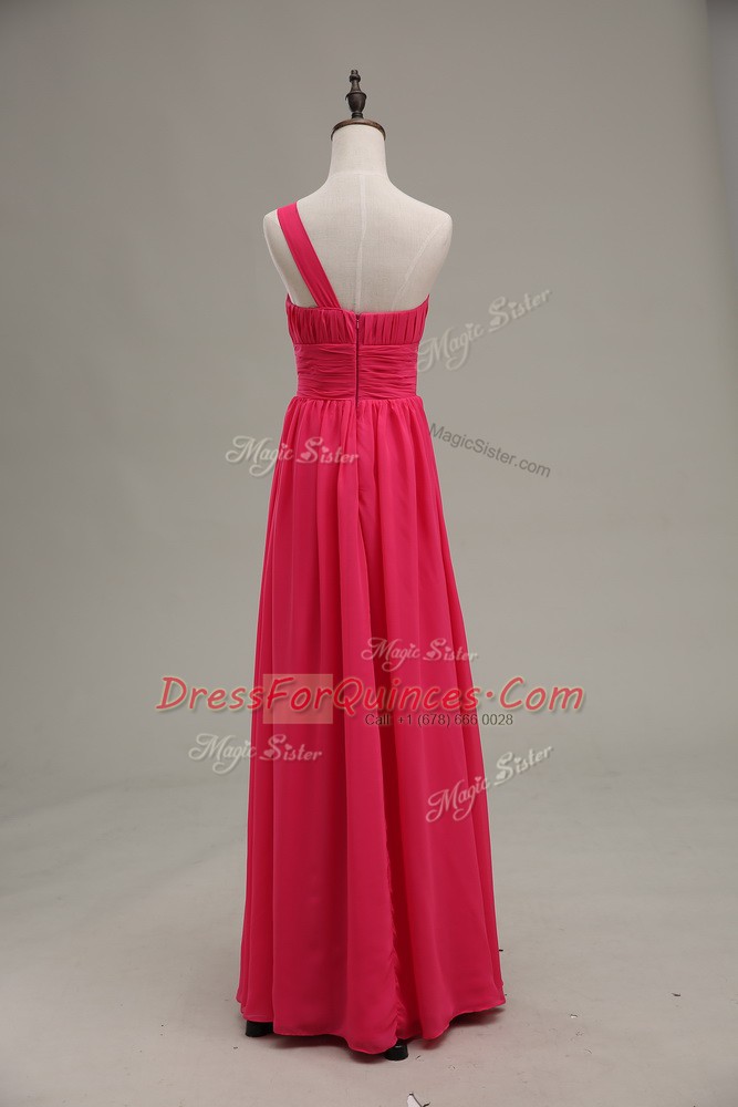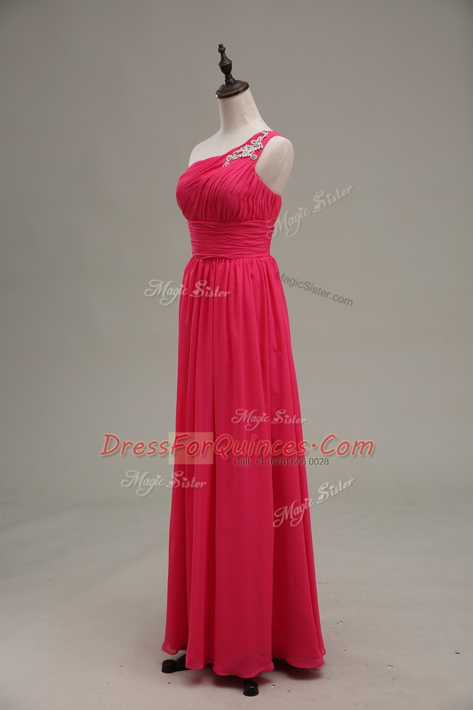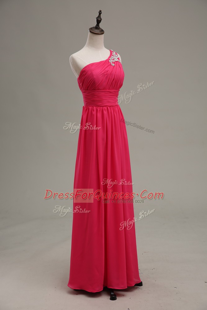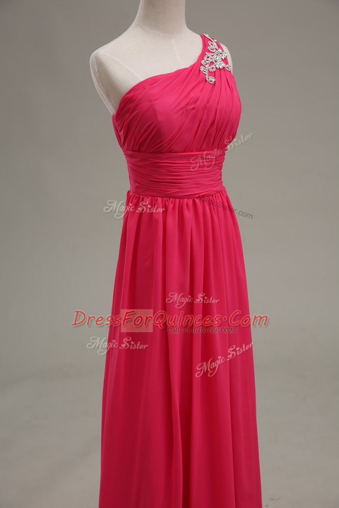 Most Popular Sleeveless Chiffon and Fabric With Rolling Flowers Floor Length Zipper Dress for Prom in Hot Pink with Beading and Ruching