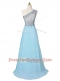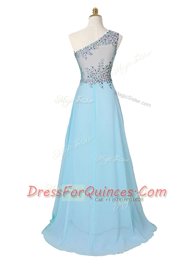 New Arrival One Shoulder Sleeveless Chiffon With Brush Train Side Zipper Prom Dresses in Aqua Blue with Beading