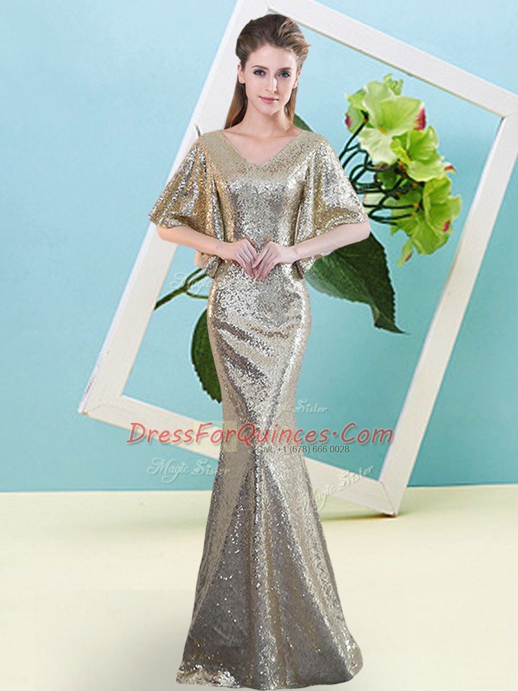 New Style Floor Length Silver Prom Dresses Sequined Half Sleeves Sequins