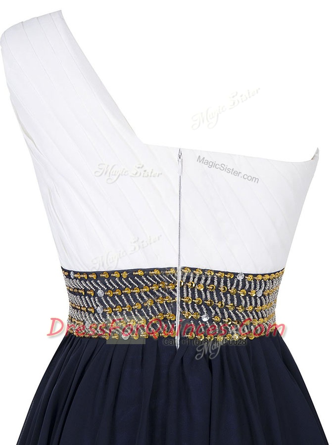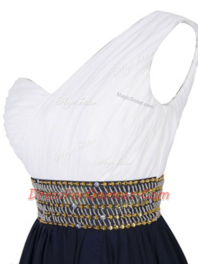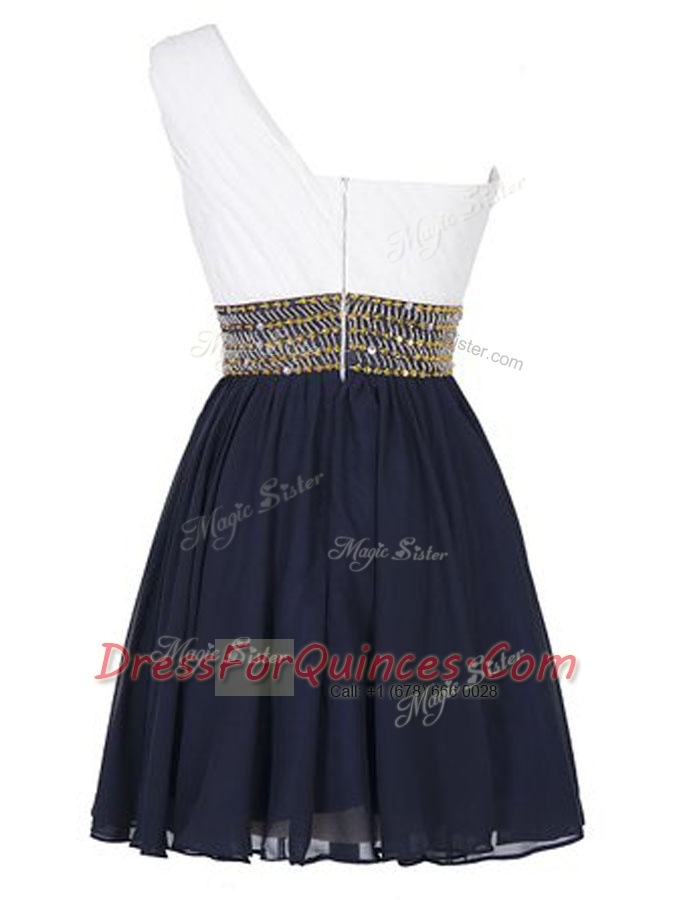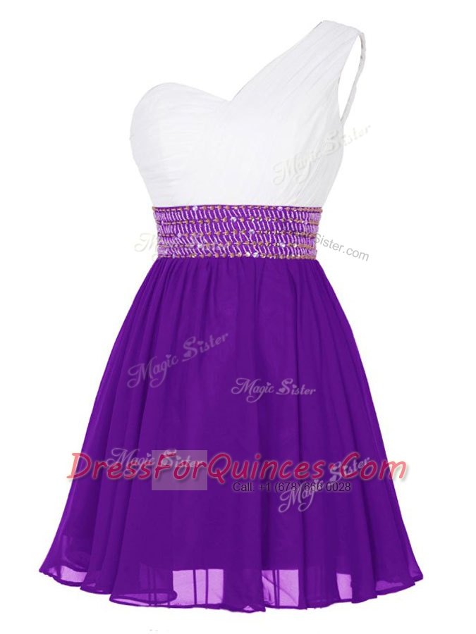 One Shoulder White And Purple Empire Beading Prom Evening Gown Zipper Chiffon Sleeveless Mini Length