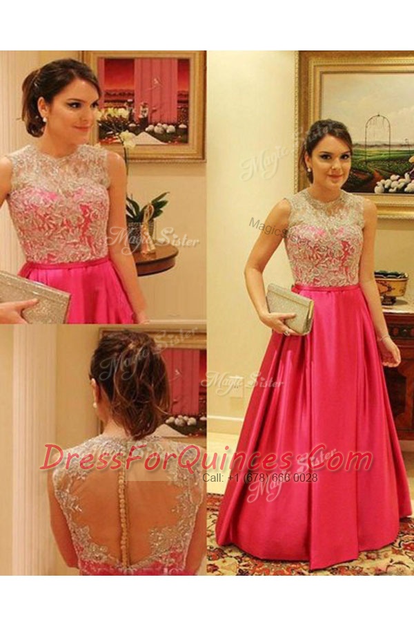 Red A-line Satin Scoop Sleeveless Lace Floor Length Zipper Prom Dress