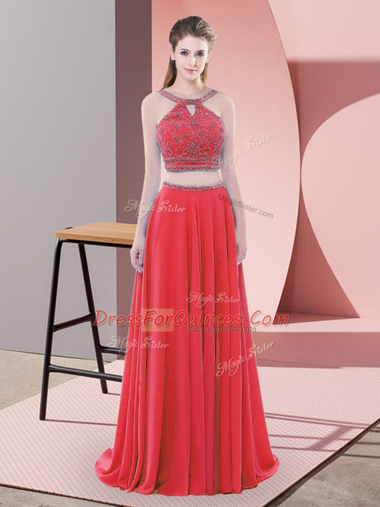 Red Chiffon Backless Straps Sleeveless Sweep Train Beading