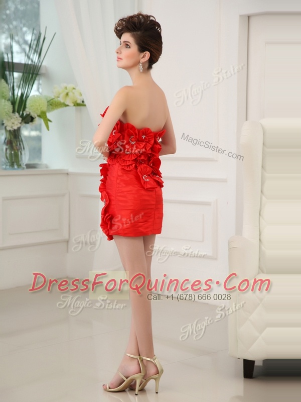Red Column/Sheath Chiffon Strapless Sleeveless Beading and Hand Made Flower Mini Length Zipper Prom Gown