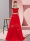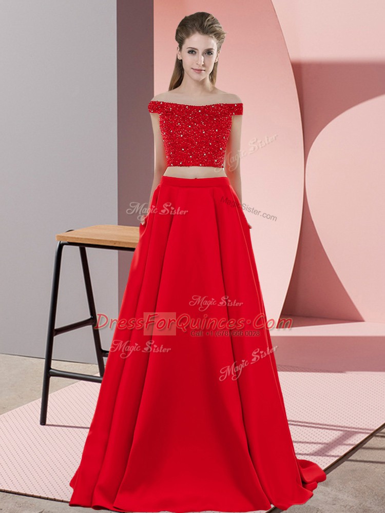 Red Off The Shoulder Backless Beading Prom Gown Sweep Train Sleeveless