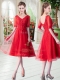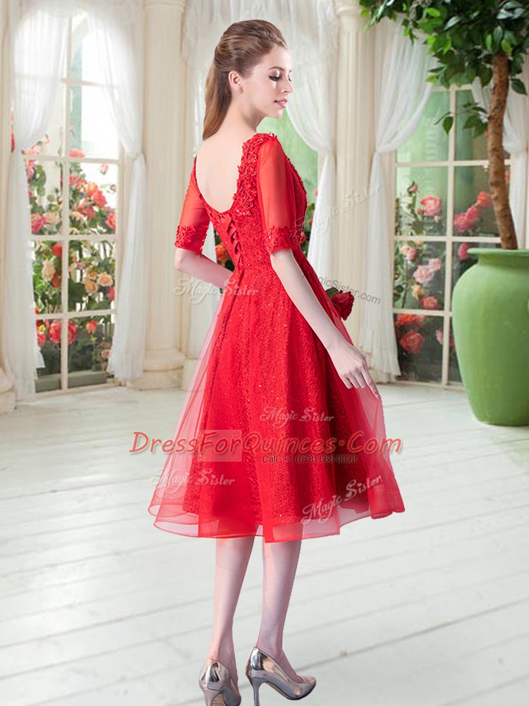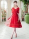 Red Tulle Lace Up V-neck Half Sleeves Knee Length Prom Dress Beading and Appliques