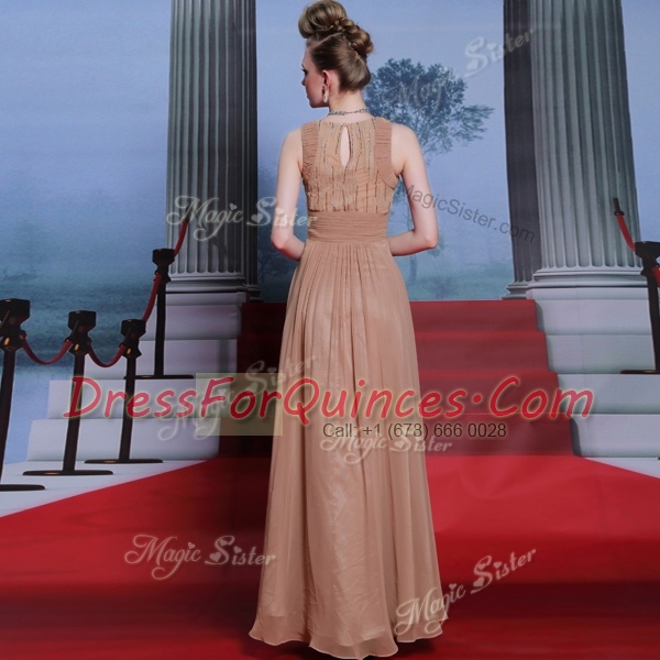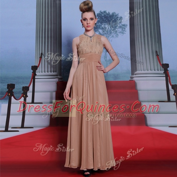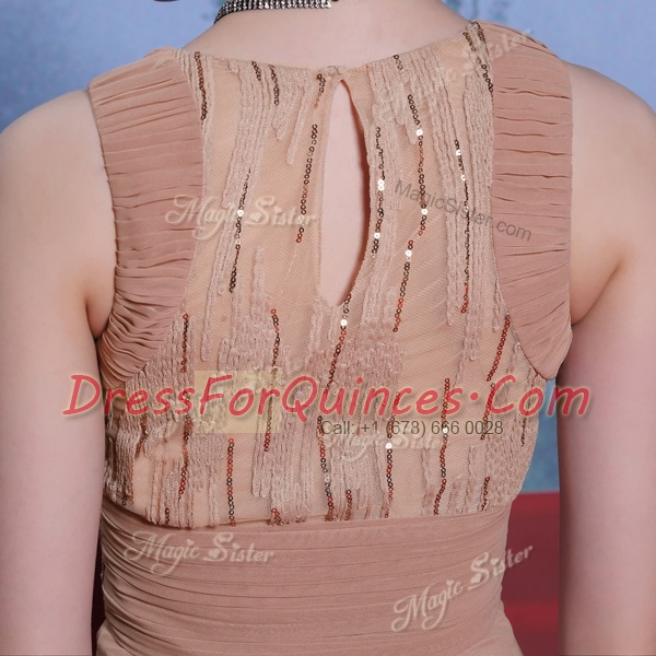 Scoop Peach Clasp Handle Prom Gown Beading and Sequins and Ruching Sleeveless Floor Length