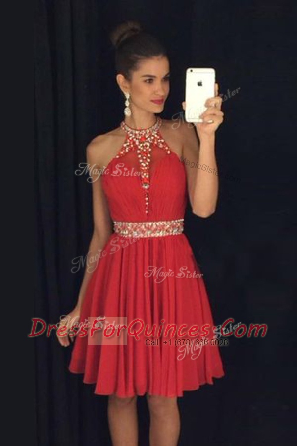 Scoop Royal Blue A-line Beading Prom Evening Gown Zipper Chiffon Sleeveless Mini Length