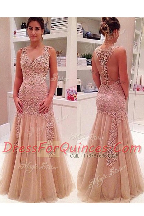 Shining Mermaid V-neck Sleeveless Zipper Homecoming Dress Peach Tulle