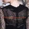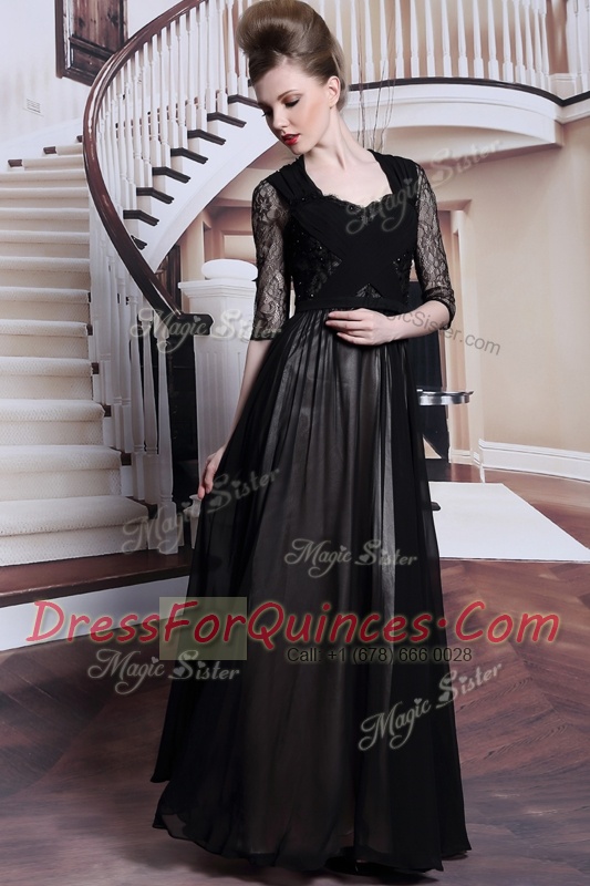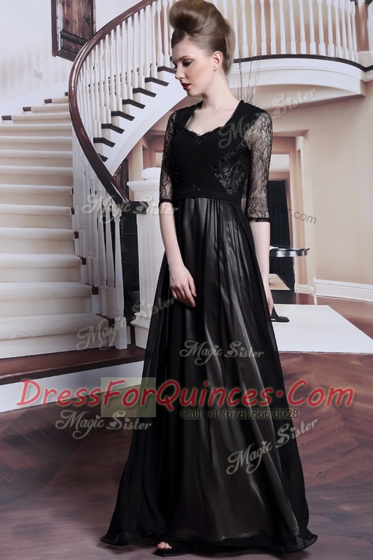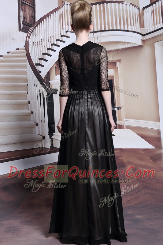 Stunning Black Chiffon Zipper V-neck Half Sleeves Floor Length Lace and Pleated
