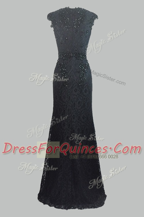Stylish Lace Cap Sleeves Floor Length Prom Dresses and Beading and Lace