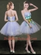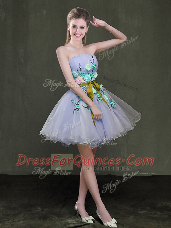 Stylish Lavender A-line Strapless Sleeveless Organza Mini Length Lace Up Appliques and Belt Prom Party Dress