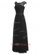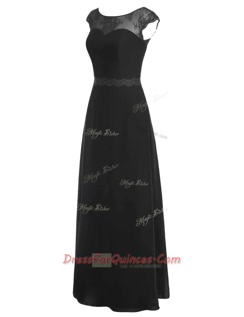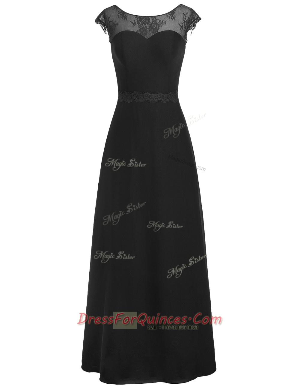 Suitable Scoop Floor Length A-line Cap Sleeves Black Prom Gown Zipper