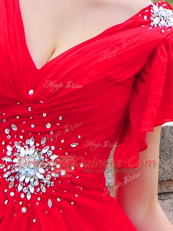 Super Cap Sleeves Brush Train Lace Up With Train Beading and Ruching Prom Evening Gown