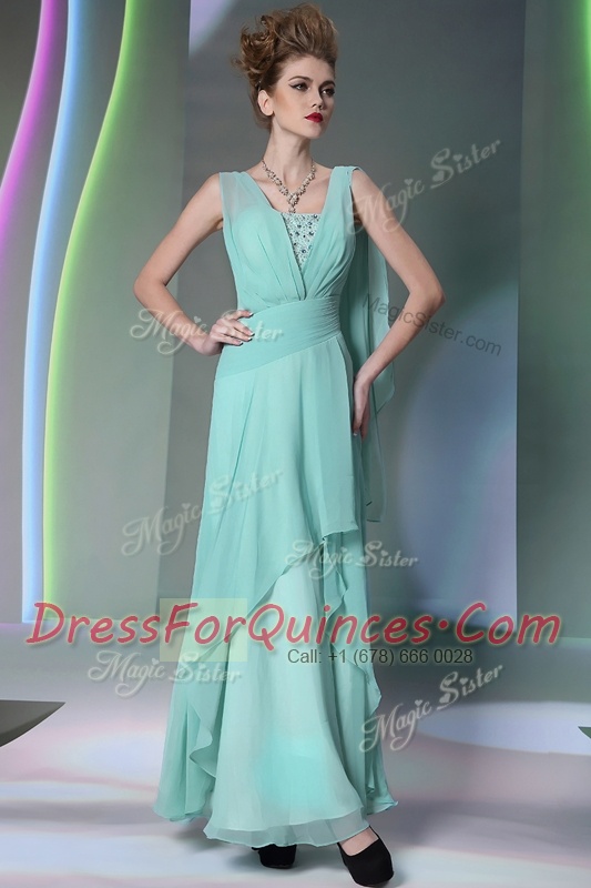 Turquoise Empire Square Sleeveless Chiffon Floor Length Side Zipper Sequins and Ruching Prom Dress