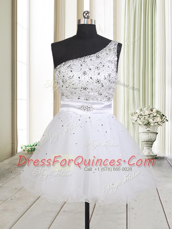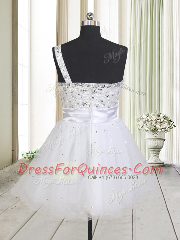 White Zipper One Shoulder Beading Prom Dresses Tulle Sleeveless