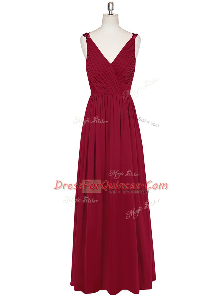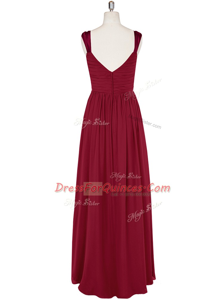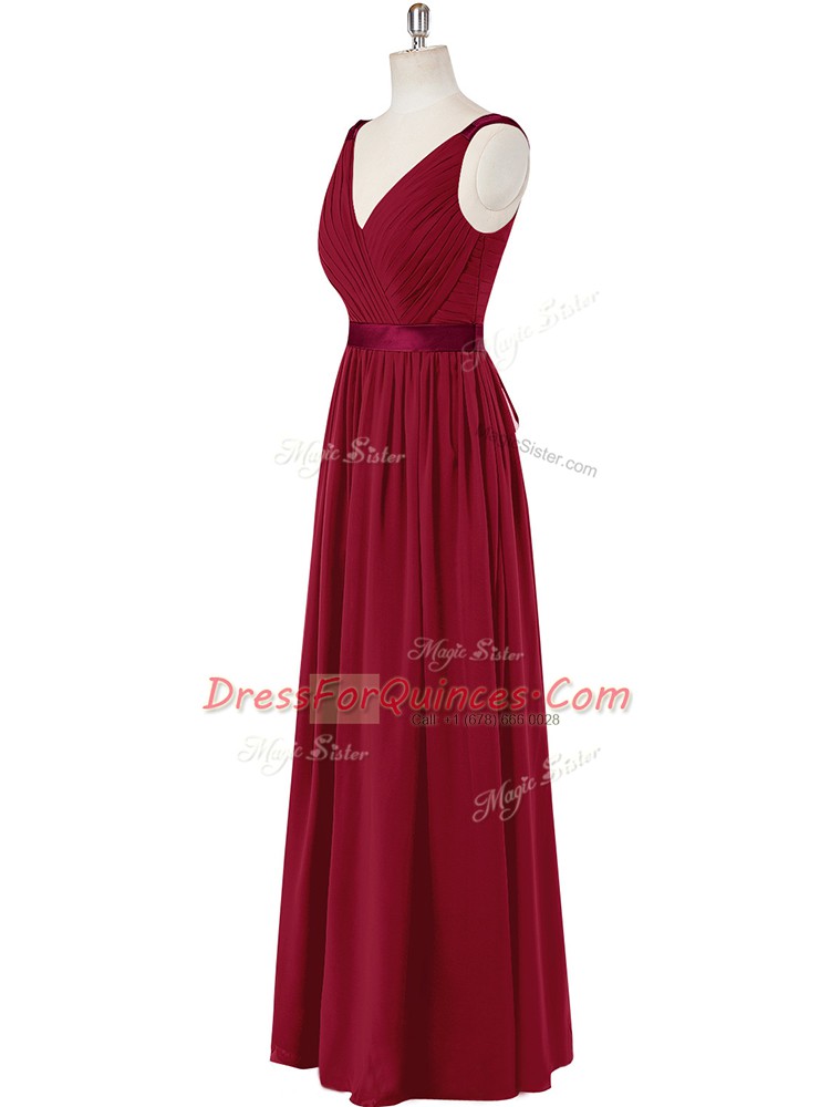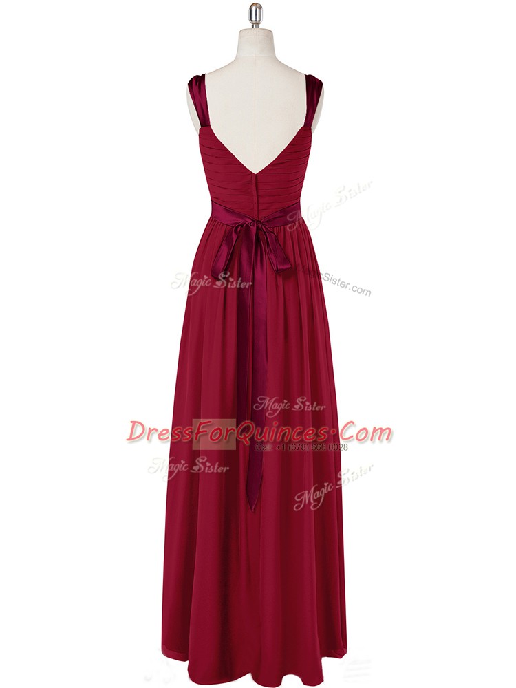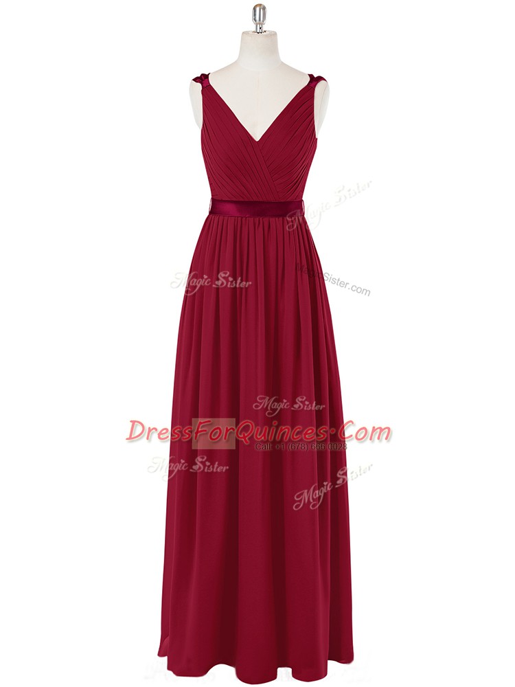 Wine Red Sleeveless Ruching and Belt Floor Length Prom Dresses