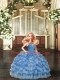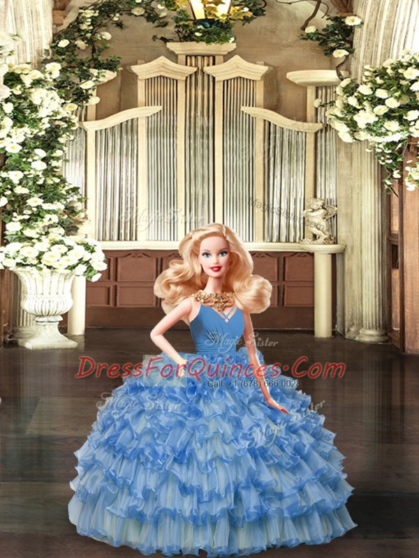 Beautiful Sleeveless Floor Length Ruffled Layers and Ruching Backless Quinceanera Gown with Blue