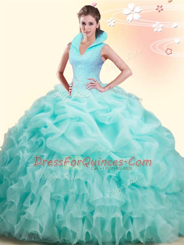 Custom Designed Backless High-neck Sleeveless 15th Birthday Dress Brush Train Beading and Ruffles and Pick Ups Apple Green Organza