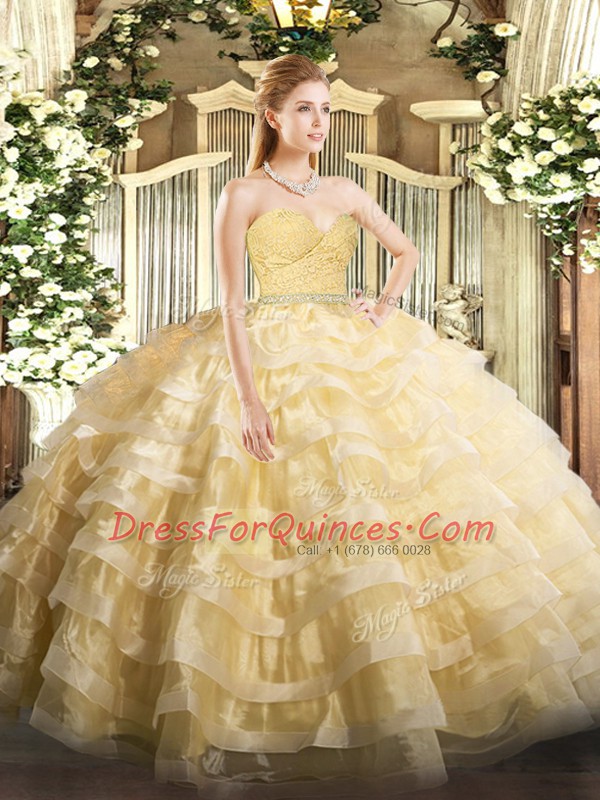 Floor Length Zipper Sweet 16 Quinceanera Dress Gold for Military Ball and Sweet 16 and Quinceanera with Beading and Lace and Ruffled Layers