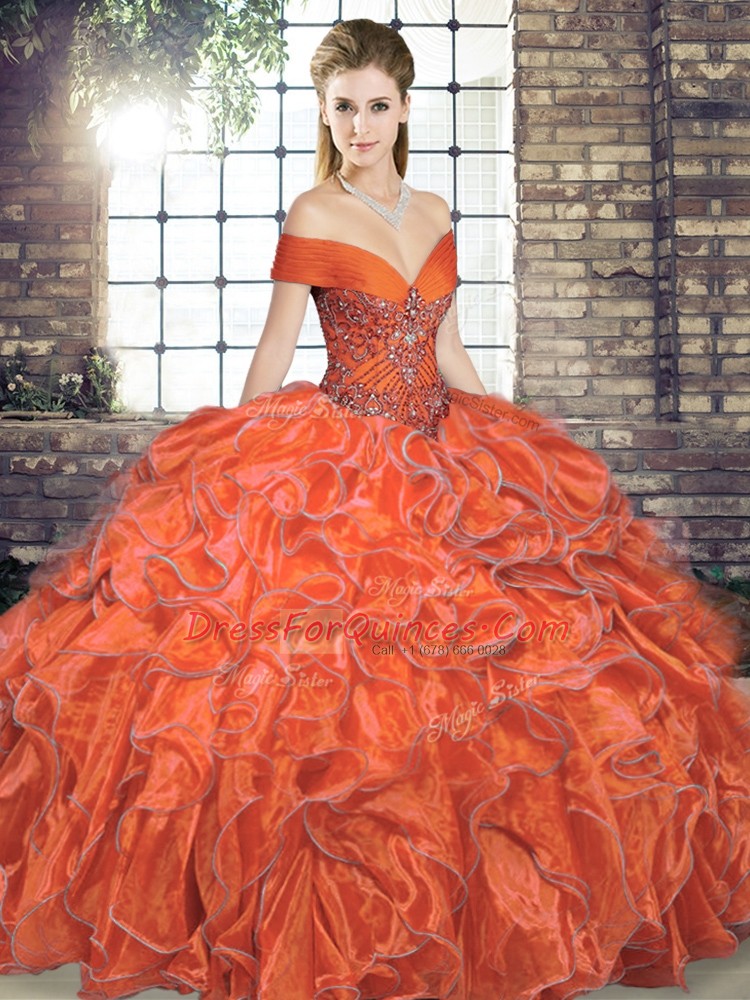 Gorgeous Sleeveless Floor Length Beading and Ruffles Lace Up 15 Quinceanera Dress with Orange Red