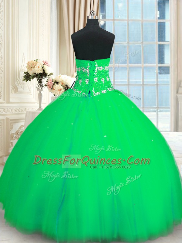 Green Ball Gowns Appliques Sweet 16 Dresses Lace Up Tulle Sleeveless Floor Length