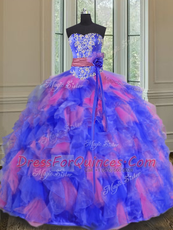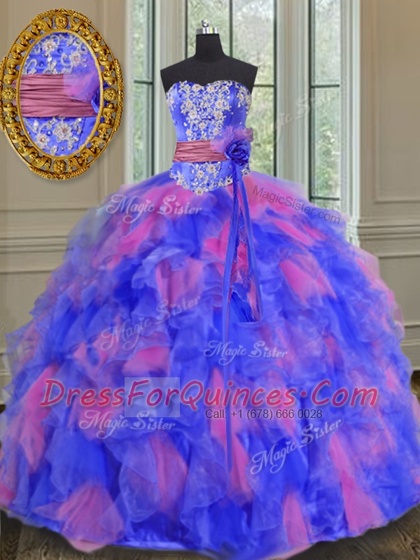 Hot Selling Multi-color Sleeveless Beading and Appliques and Ruffles and Sashes ribbons and Hand Made Flower Floor Length 15 Quinceanera Dress