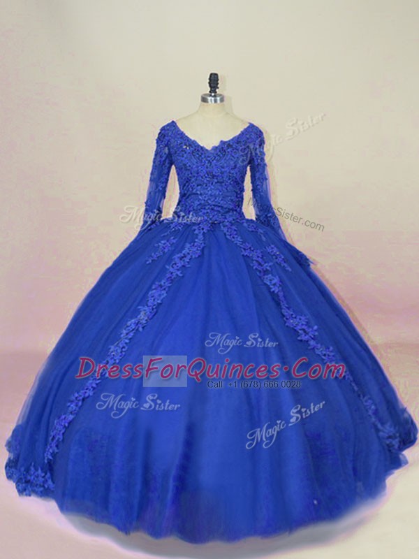 Long Sleeves Lace and Appliques Lace Up Ball Gown Prom Dress with Royal Blue