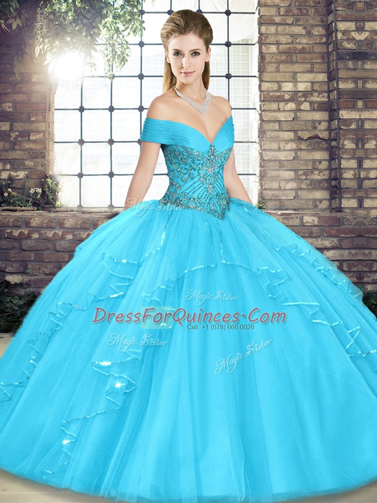 Low Price Aqua Blue Sleeveless Tulle Lace Up Quince Ball Gowns for Military Ball and Sweet 16 and Quinceanera