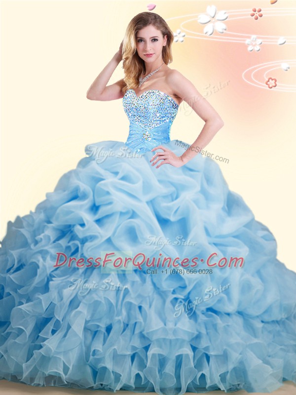 Organza Sleeveless With Train Sweet 16 Quinceanera Dress Brush Train and Beading and Ruffles and Pick Ups