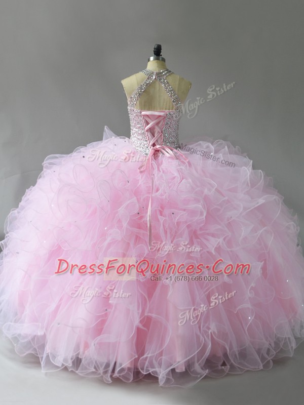 Pink Tulle Lace Up Halter Top Sleeveless Floor Length Ball Gown Prom Dress Beading and Ruffles