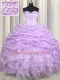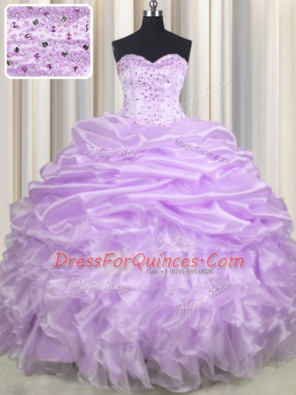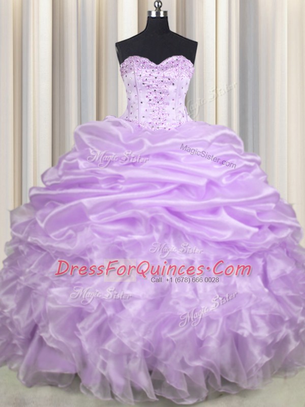 Popular Lavender Sleeveless With Train Beading and Ruffles and Pick Ups Lace Up Quinceanera Gowns