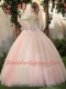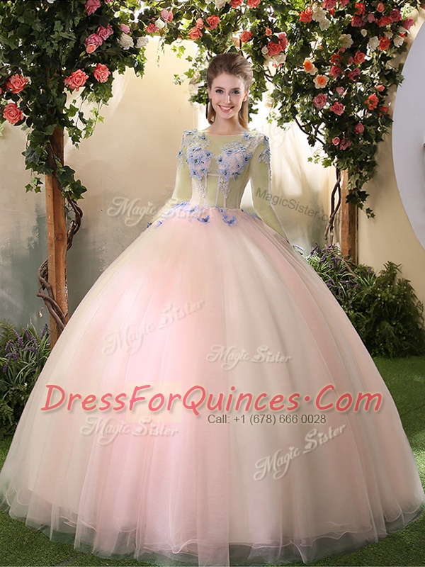 Popular Scoop Peach Lace Up Vestidos de Quinceanera Appliques Long Sleeves Floor Length