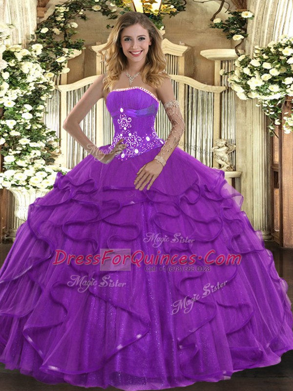 Purple Ball Gowns Strapless Sleeveless Tulle Floor Length Lace Up Beading and Ruffles Sweet 16 Quinceanera Dress