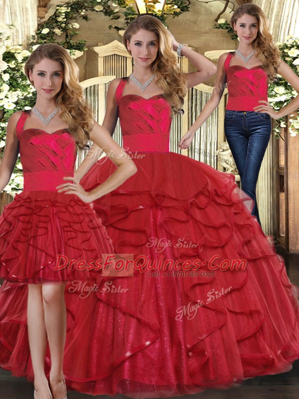 Red Straps Neckline Ruffles Ball Gown Prom Dress Sleeveless Lace Up