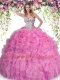 Rose Pink Ball Gowns Beading and Ruffles Sweet 16 Quinceanera Dress Lace Up Organza Sleeveless Floor Length