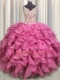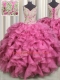 Rose Pink Ball Gowns Organza V-neck Sleeveless Beading and Ruffles Floor Length Lace Up Vestidos de Quinceanera