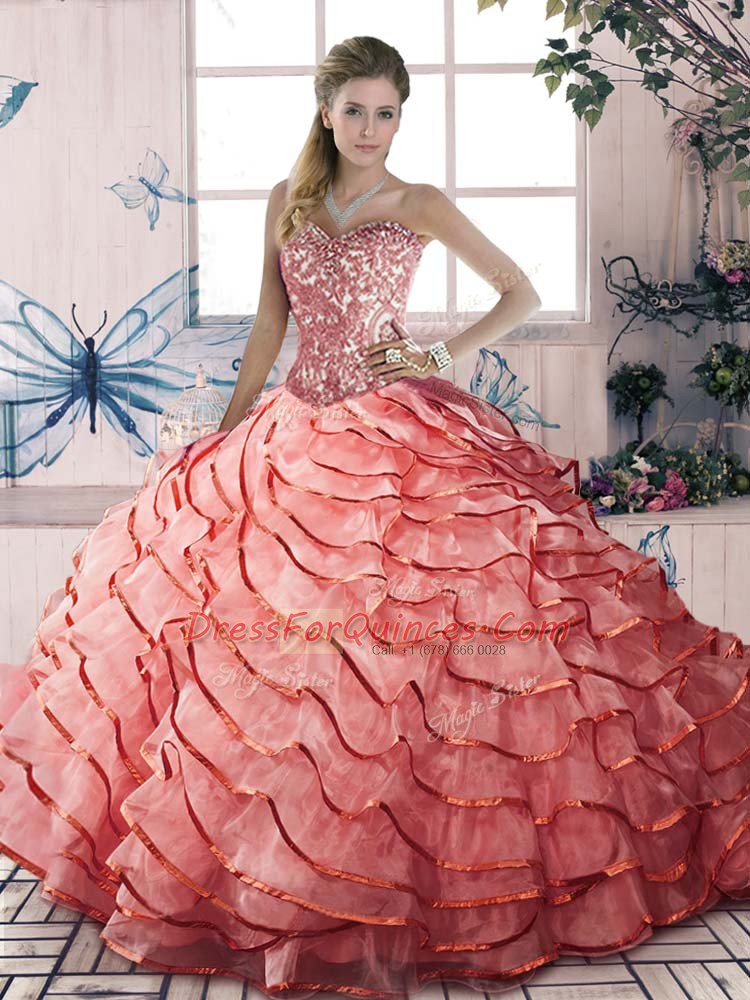 Sleeveless Brush Train Lace Up Beading and Ruffled Layers Quince Ball Gowns
