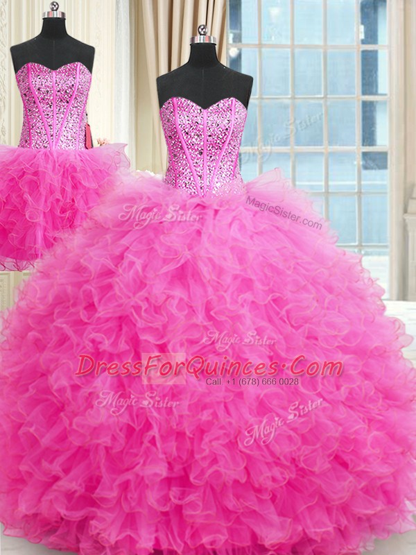 Three Piece Ball Gowns 15 Quinceanera Dress Rose Pink Strapless Tulle Sleeveless Floor Length Lace Up