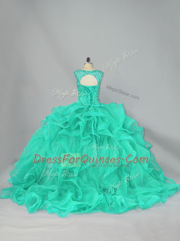 Turquoise Ball Gowns Scoop Sleeveless Organza Floor Length Lace Up Beading and Ruffles 15 Quinceanera Dress