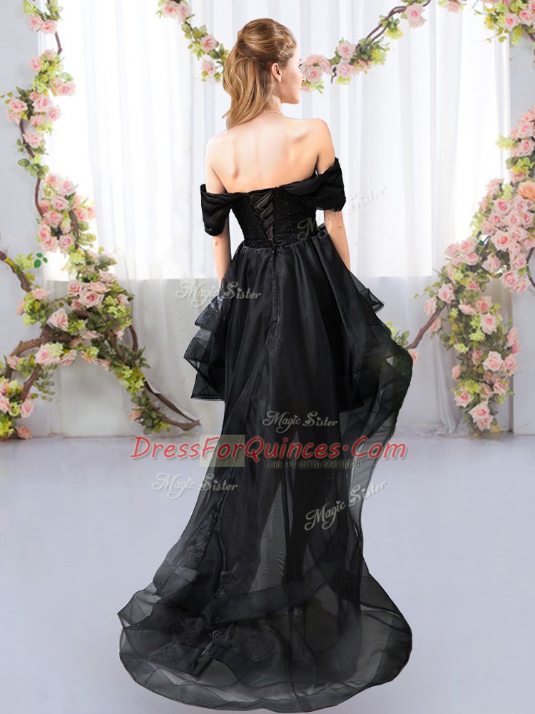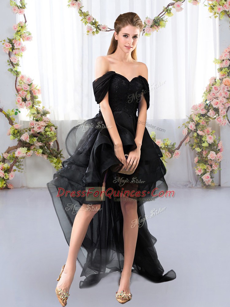 Black Off The Shoulder Neckline Lace and Ruffled Layers Court Dresses for Sweet 16 Short Sleeves Lace Up