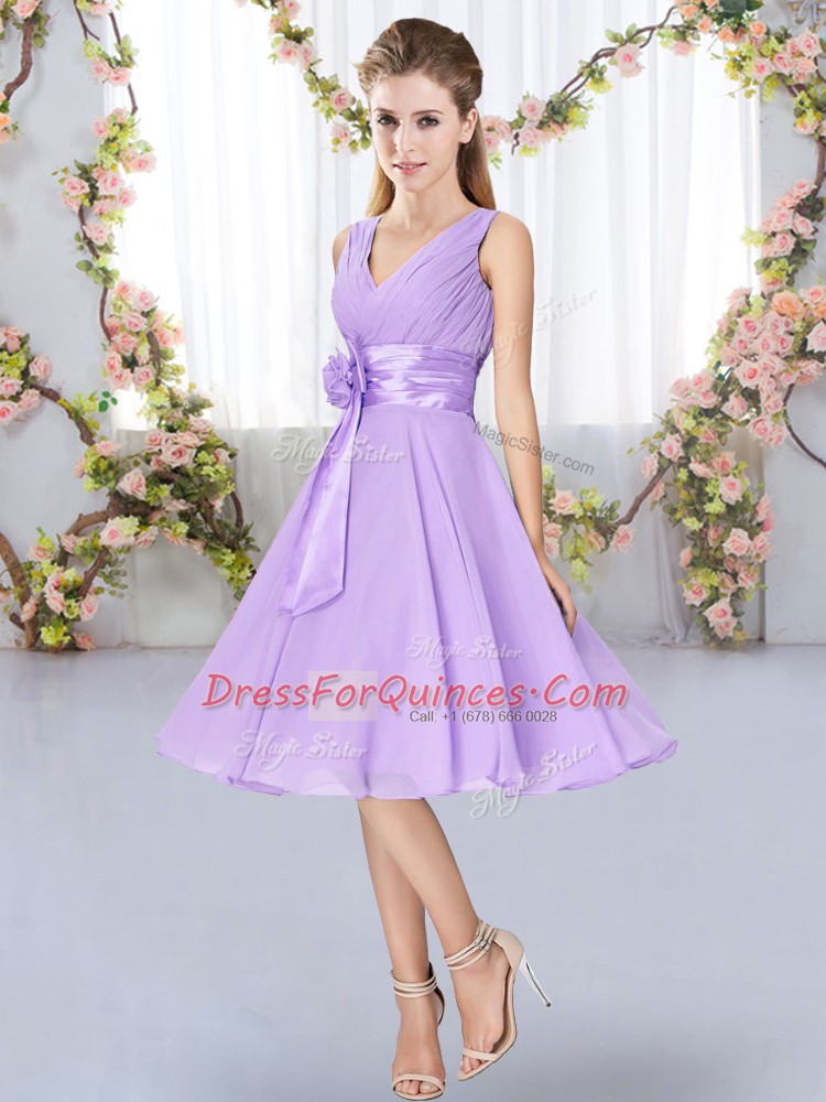 Dazzling Lavender Empire V-neck Sleeveless Chiffon Knee Length Lace Up Hand Made Flower Quinceanera Court of Honor Dress